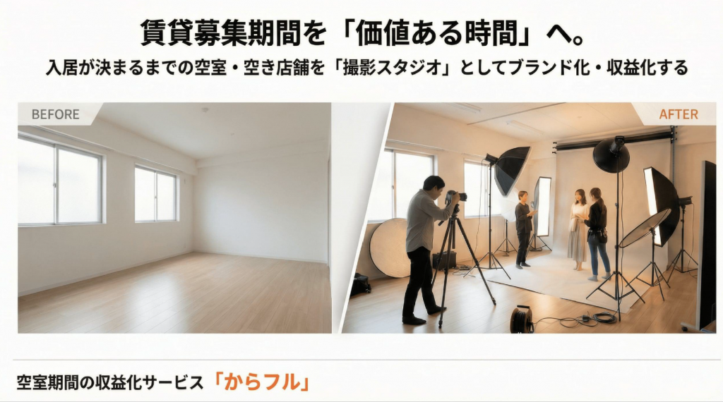 賃貸の入居募集中の期間、店舗や事務所の空き時間を撮影ロケ地として貸し出すサービス「からフル」のサービス紹介資料です。撮影ロケ地に貸し出すことでブランディングと収益化を実現させます。