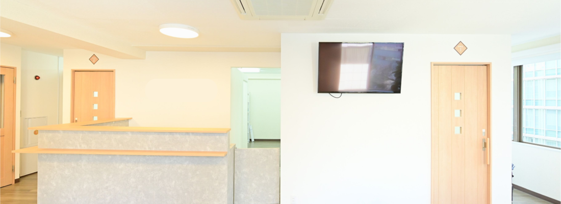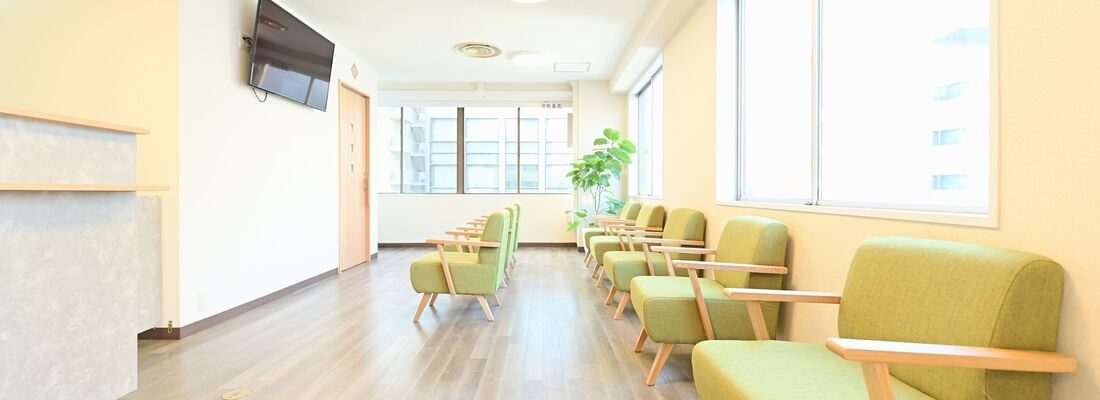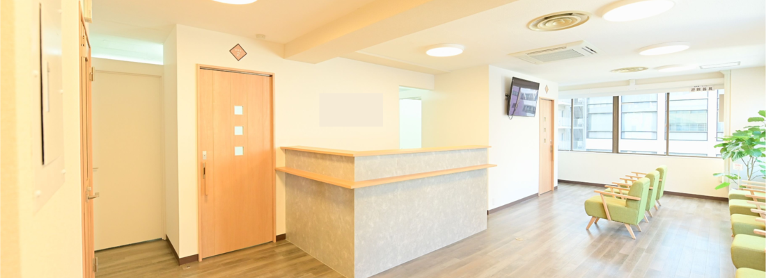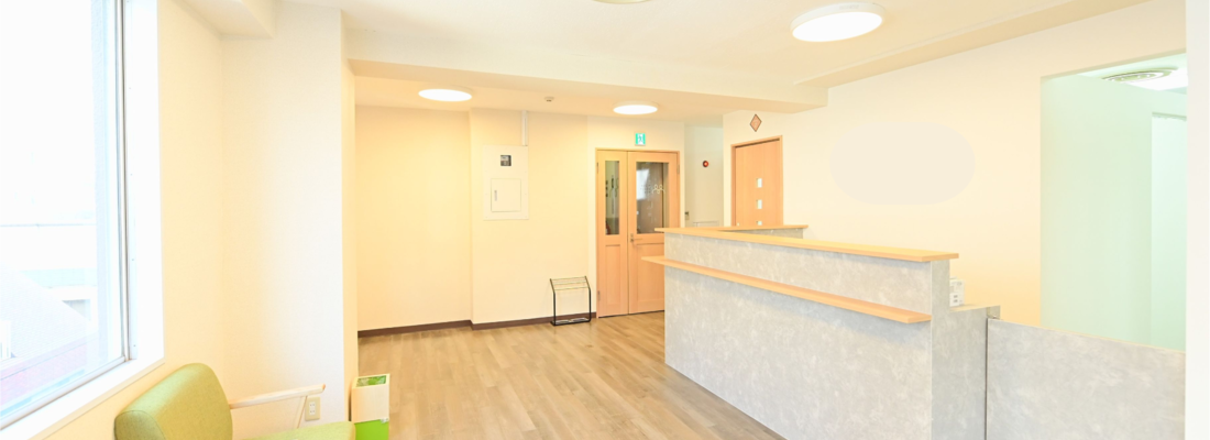 ・90㎡の広々とした空間は、白と緑を基調にした清潔感溢れるデザインで、モダンなクリニックなデザインです。